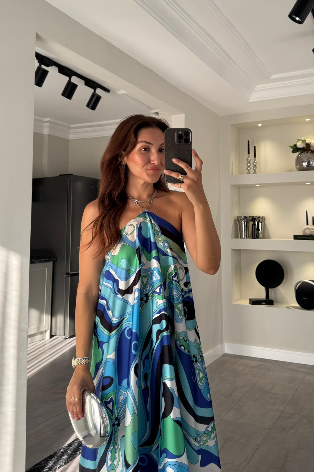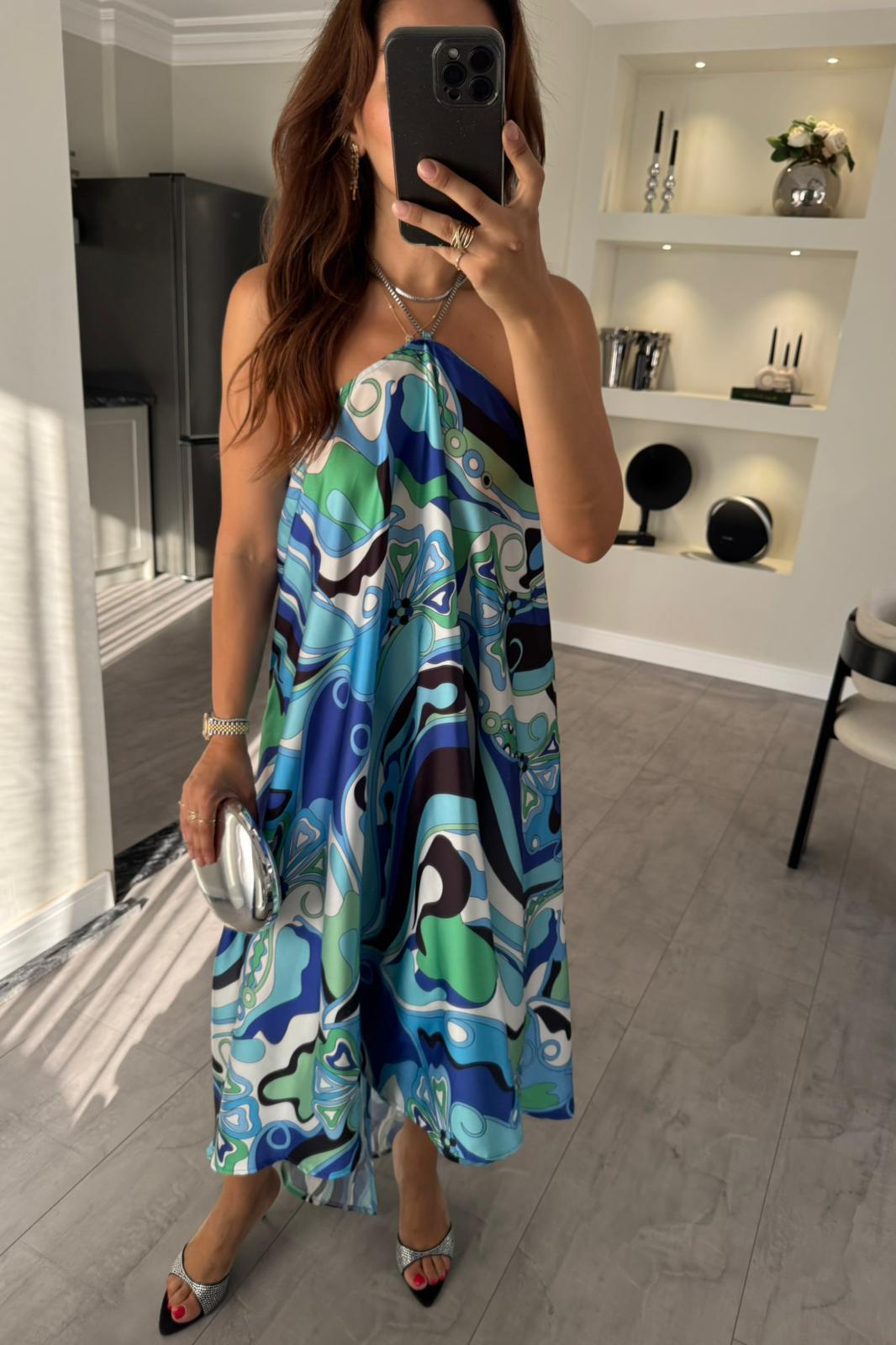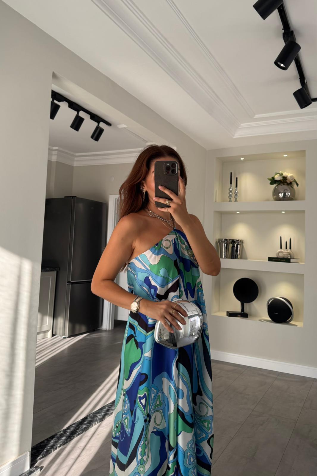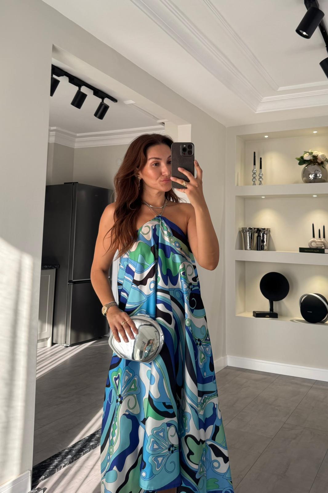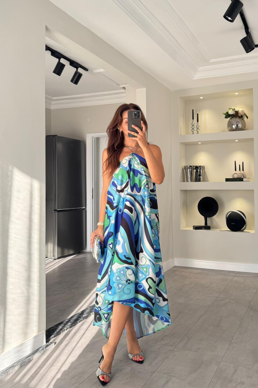 BOYUNDAN KOLYELİ DESENLİ SATEN ELBİSE/7262