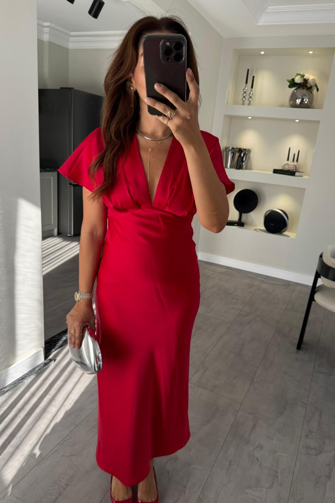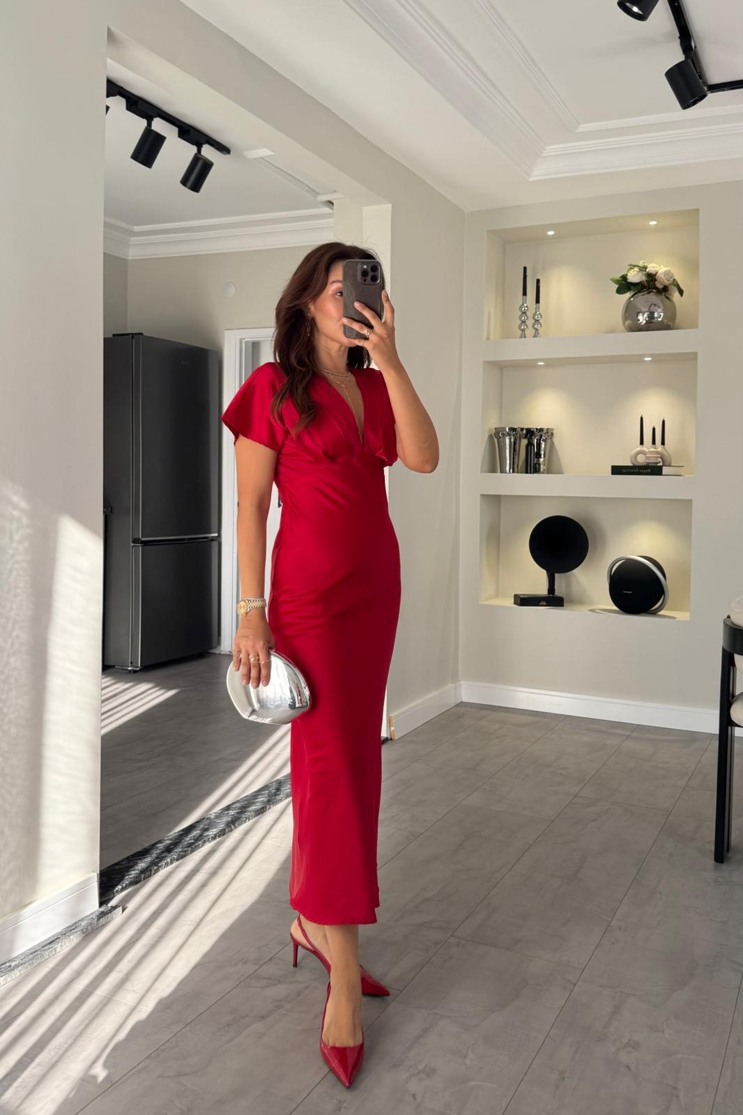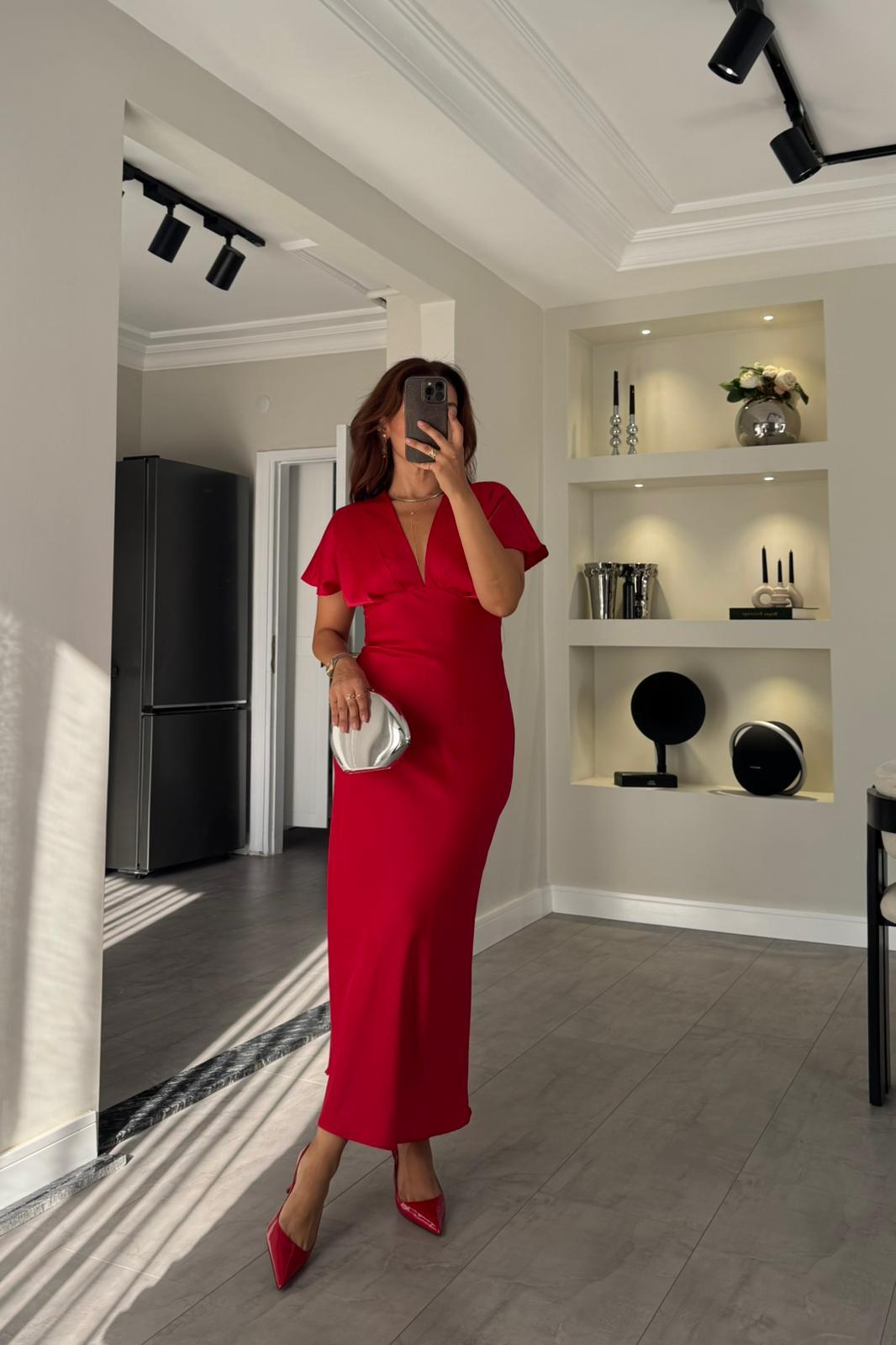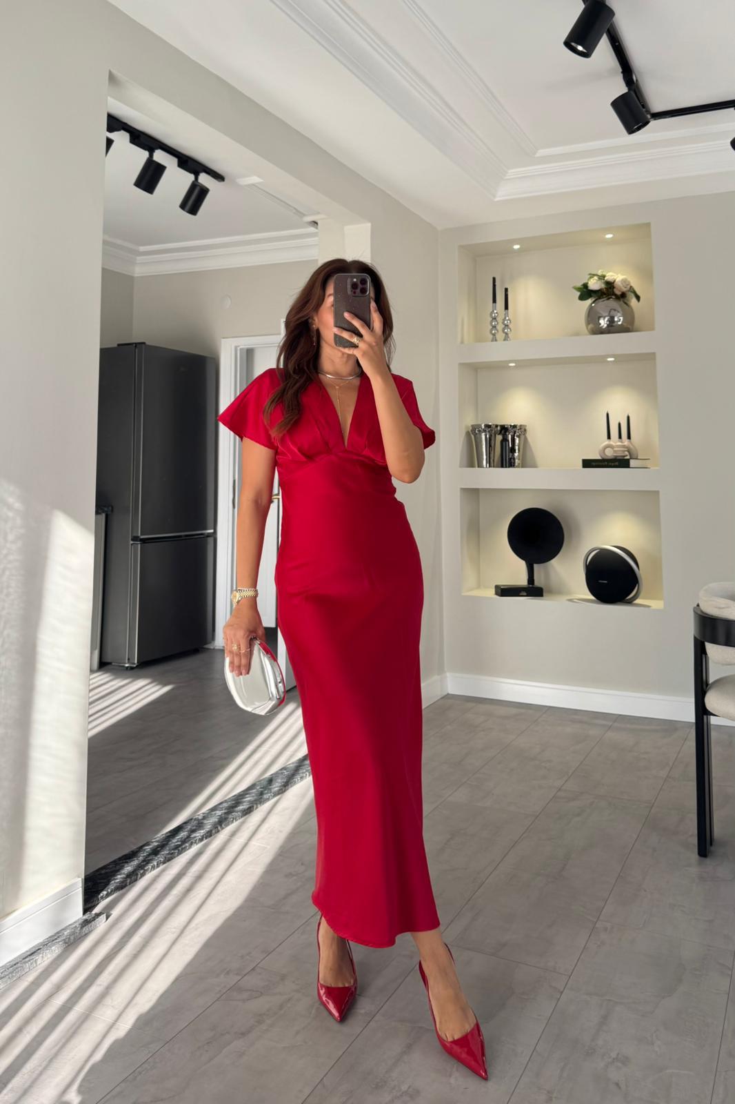 V YAKA DÜŞÜK OMUZ SATEN ELBİSE TAM KALIPTIR