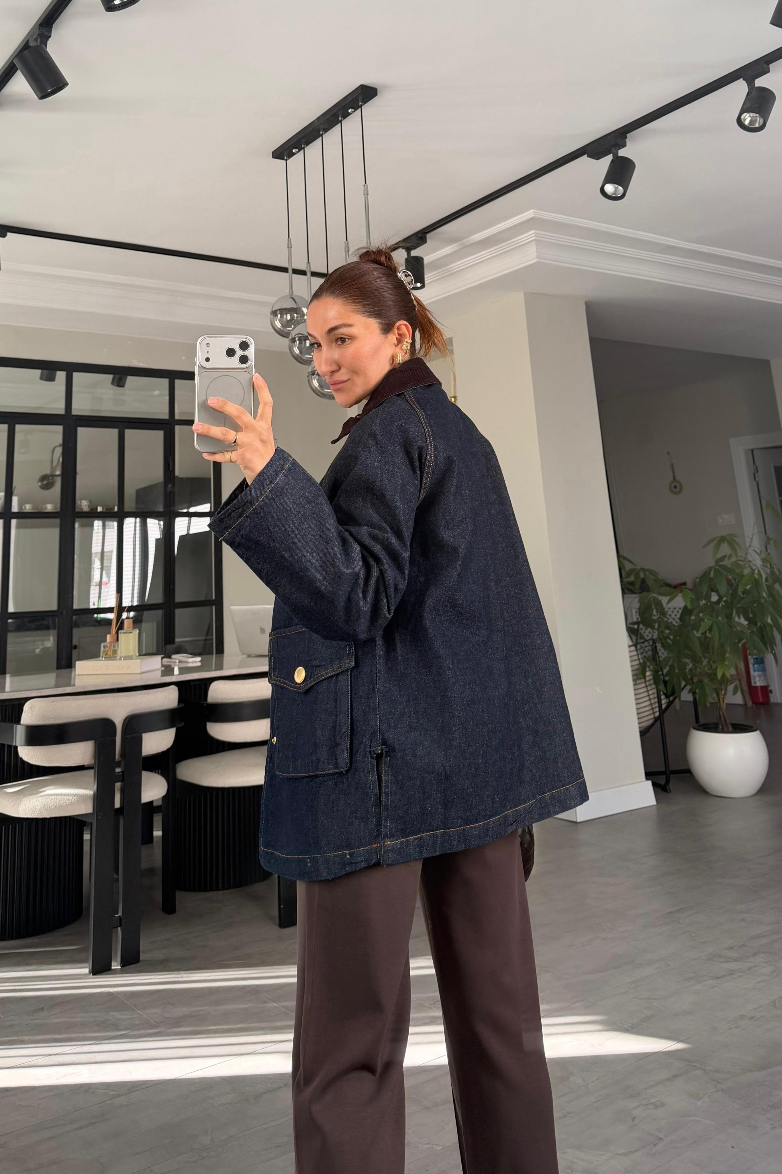 GOLD DÜĞMELİ KADİFE YAKA DENİM CEKET