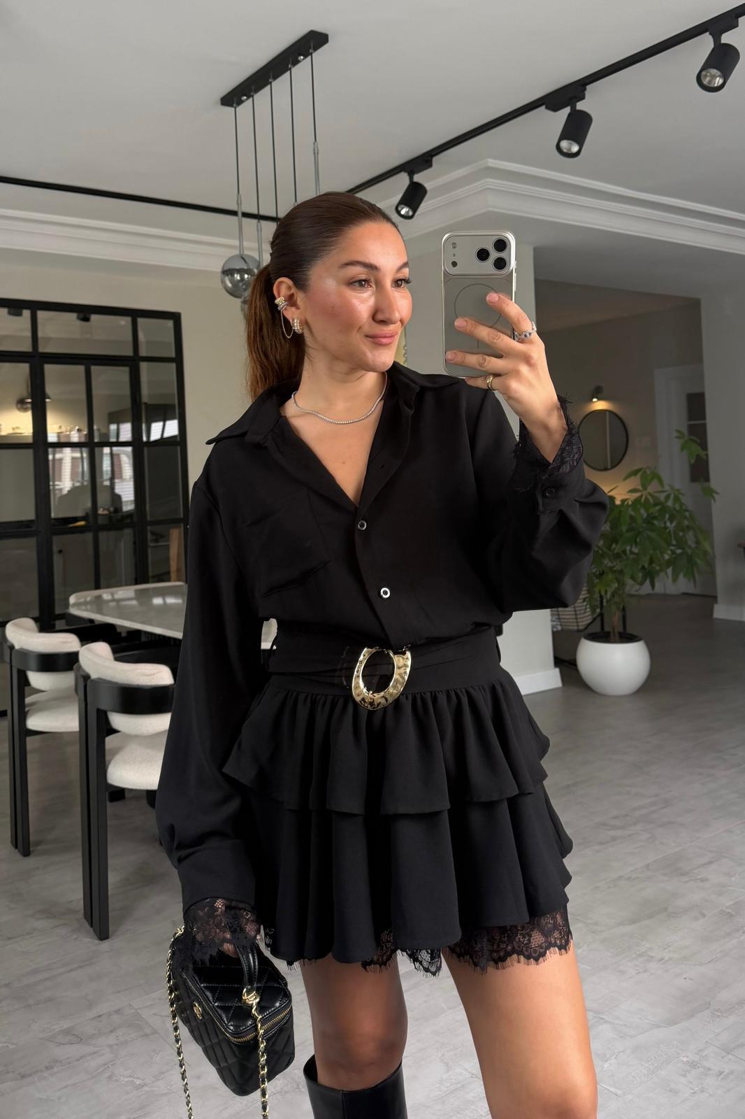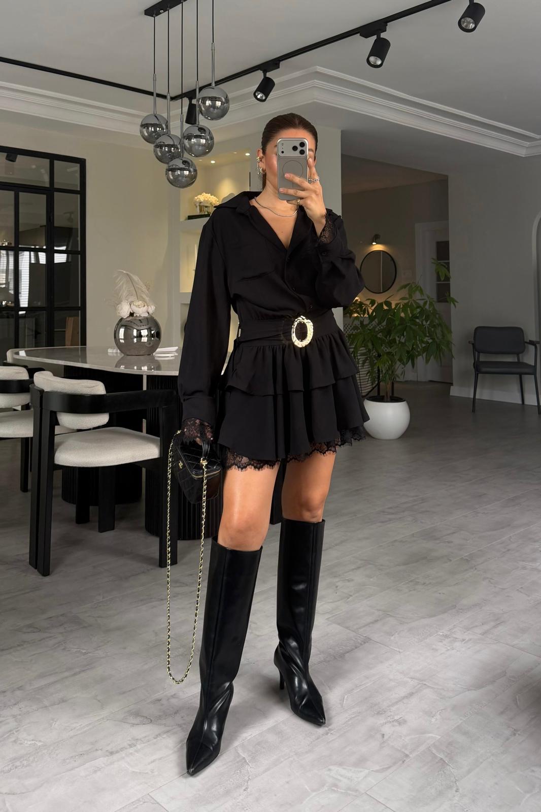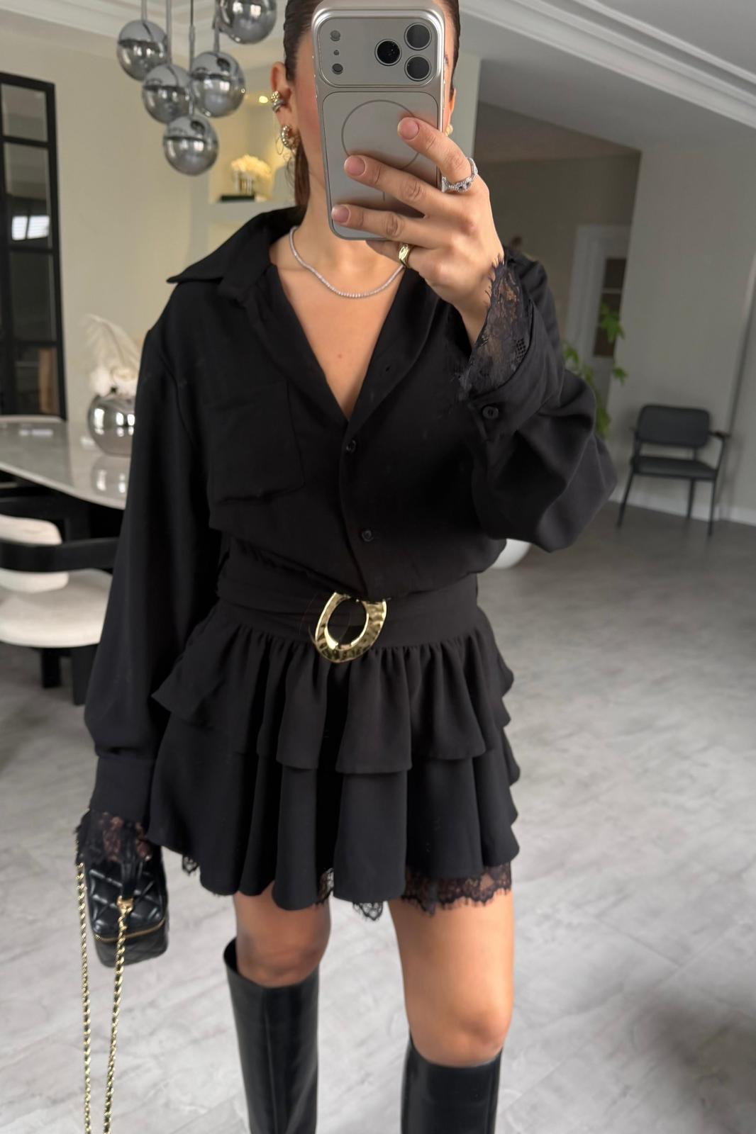 GOLD TOKALI DANTEL KATLI MİNİ ELBİSE/4866
