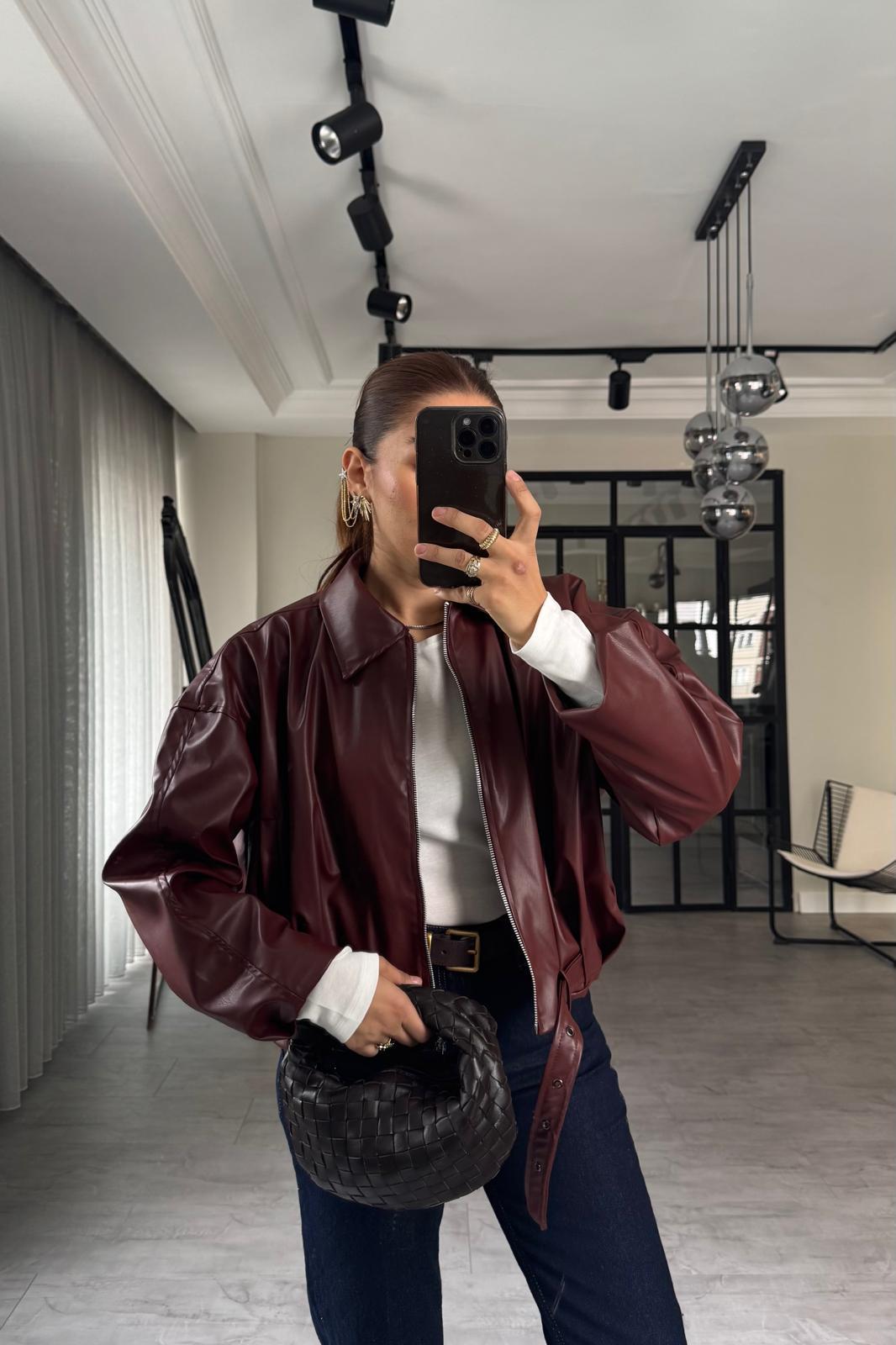 KEMER DETAYLI CROP DERİ CEKET KEMER DETAYLI CROP DERİ CEKET