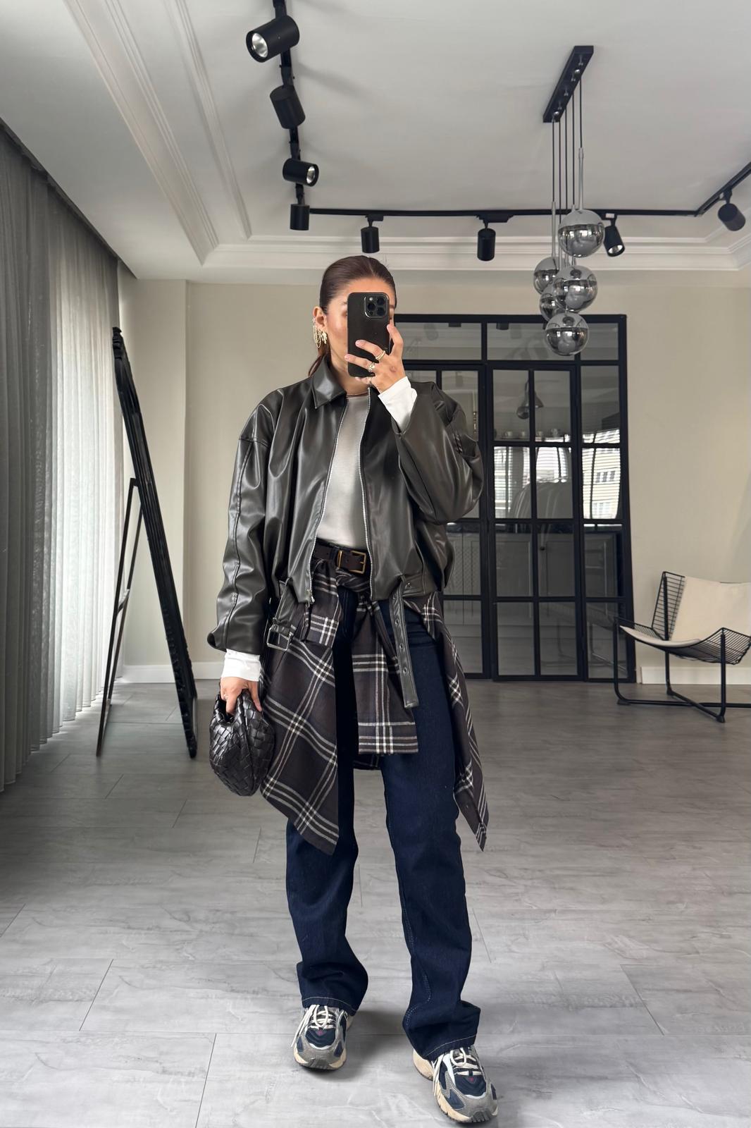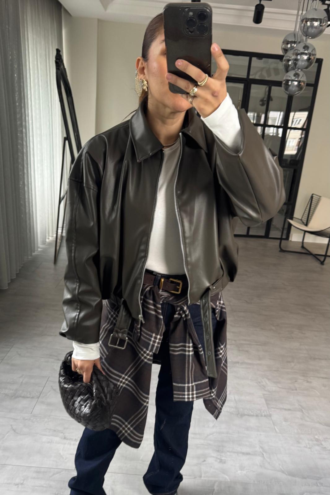 KEMER DETAYLI CROP DERİ CEKET KEMER DETAYLI CROP DERİ CEKET