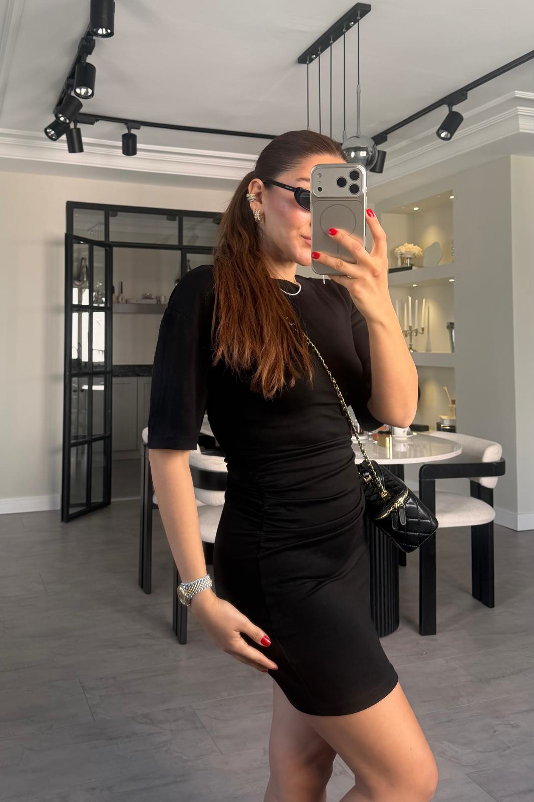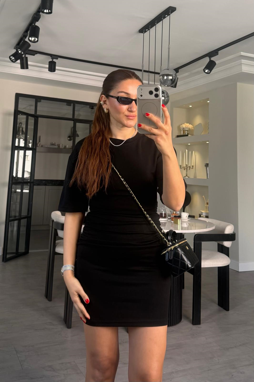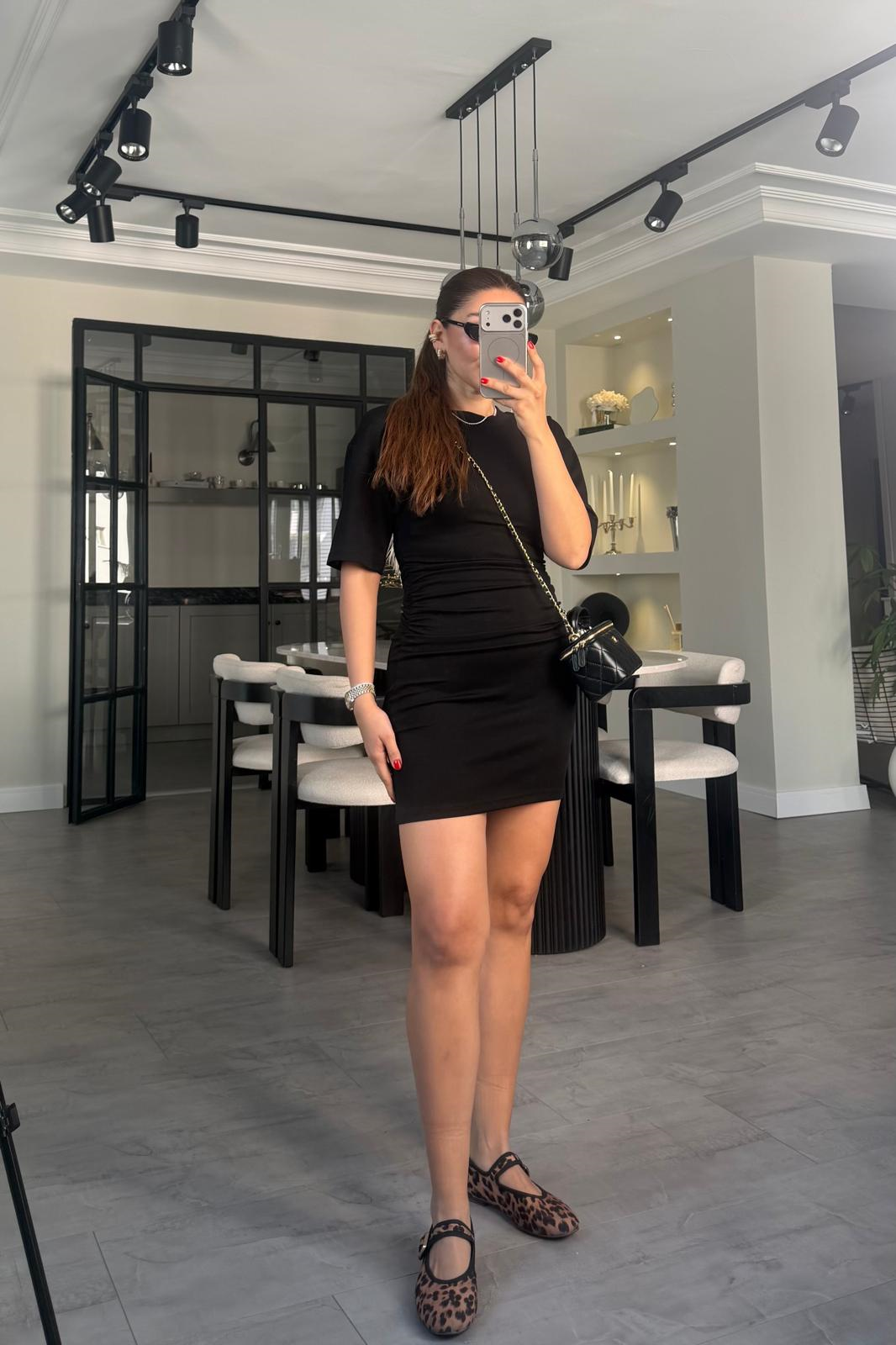 KISAKOL YANDAN BÜZGÜLÜ MİNİ ELBİSE/11509