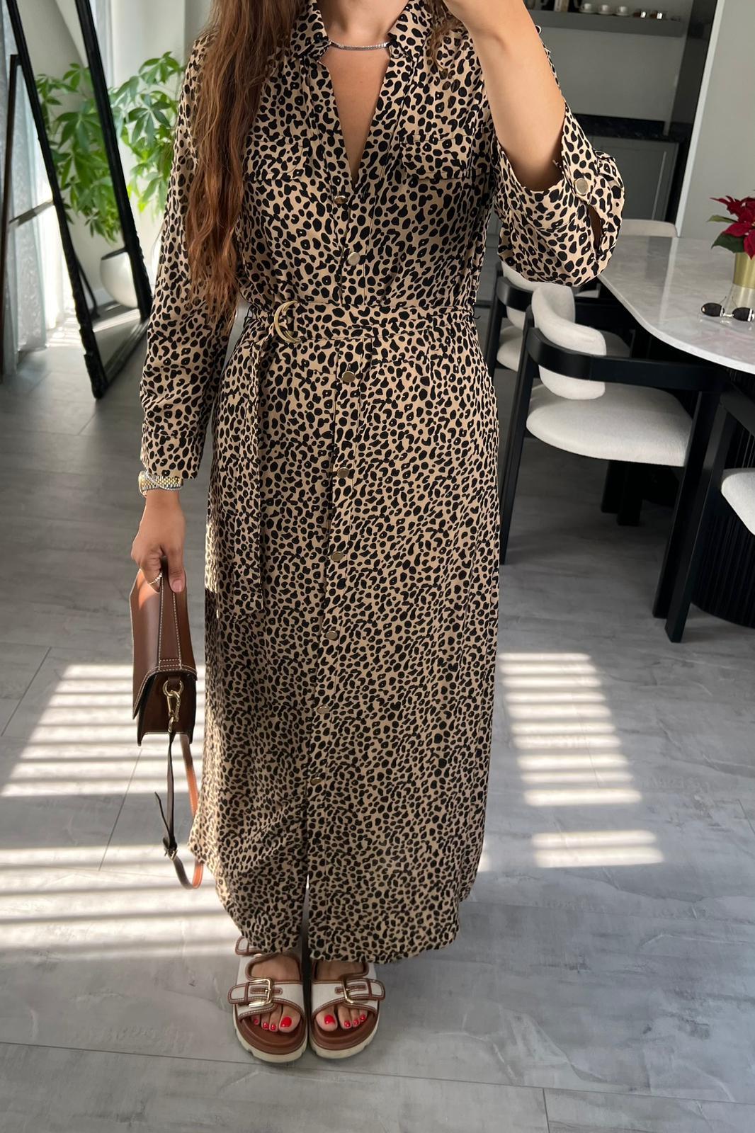 DÜĞMELİ LEOPAR DESEN GÖMLEK ELBİSE