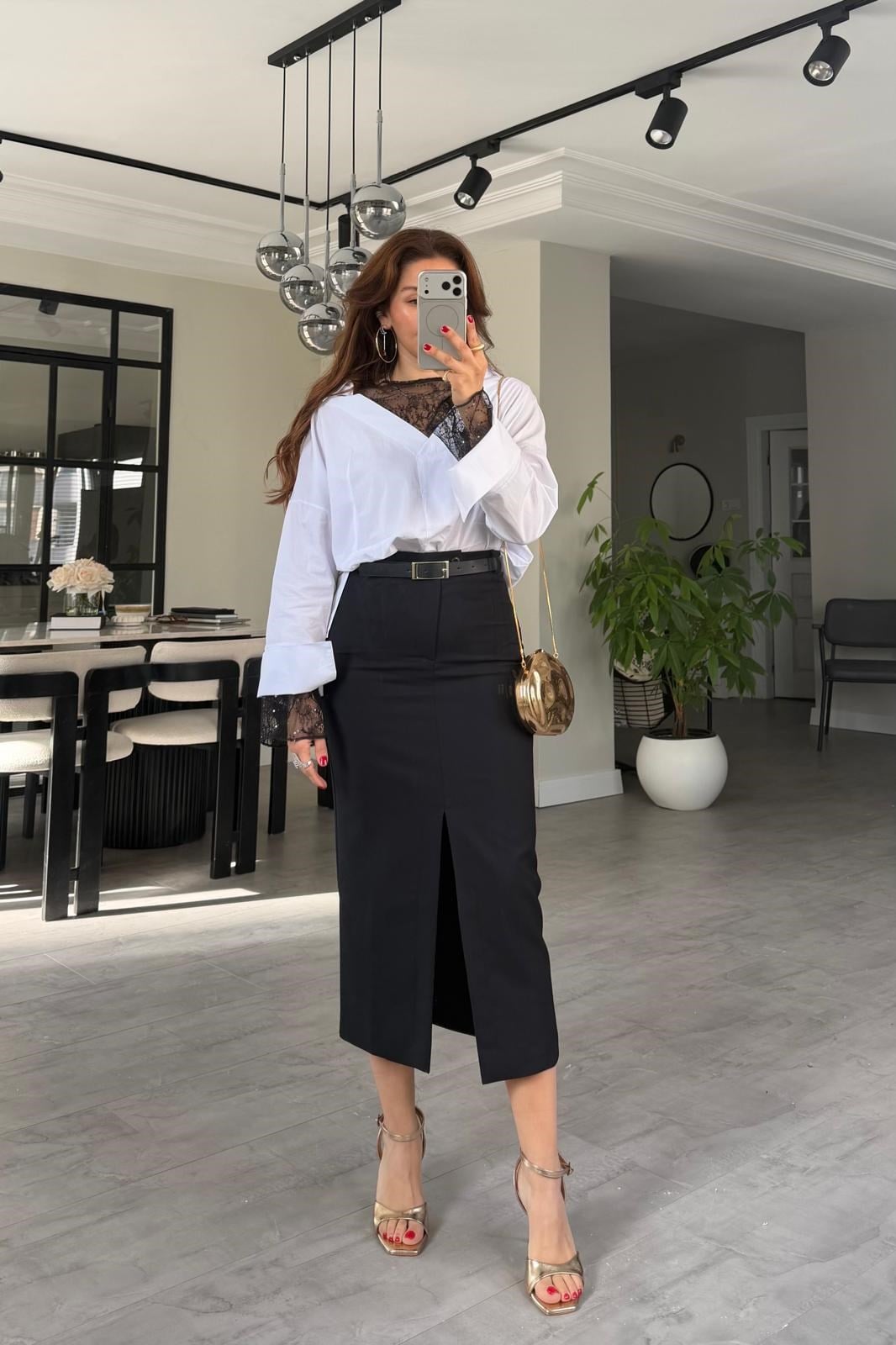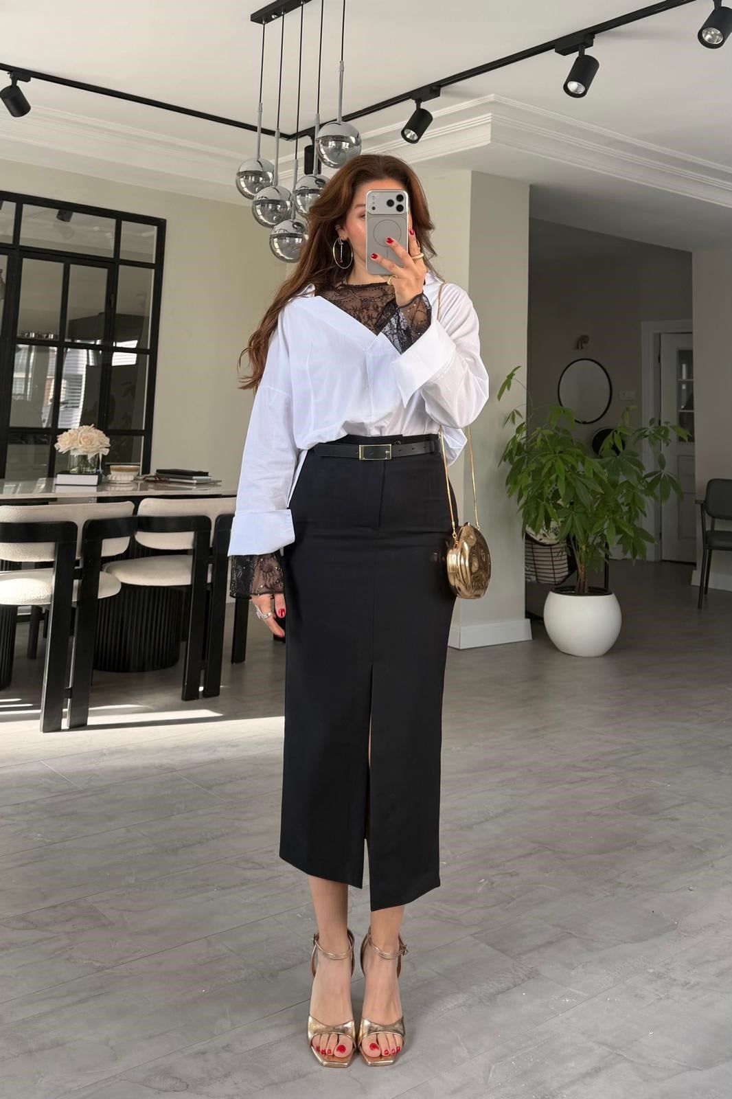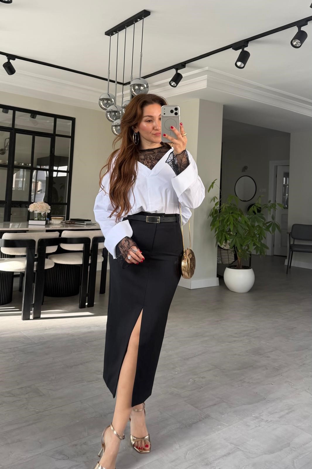 ÖNÜ YIRTMAÇLI KEMERLİ ETEK/3006