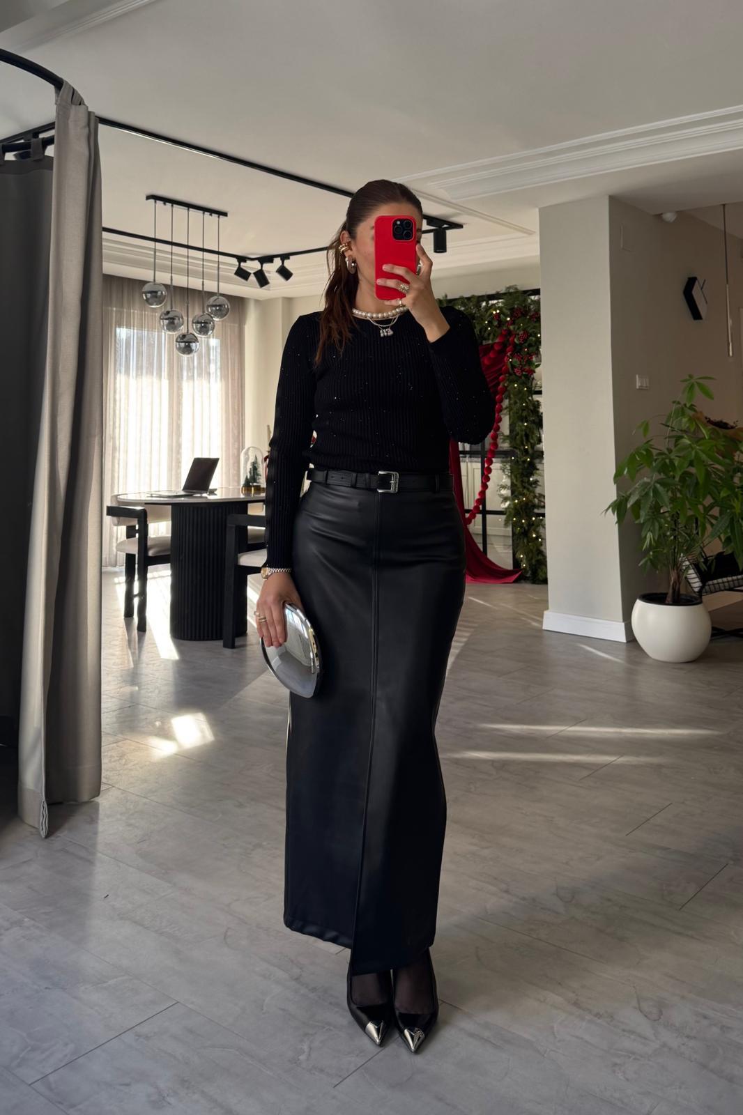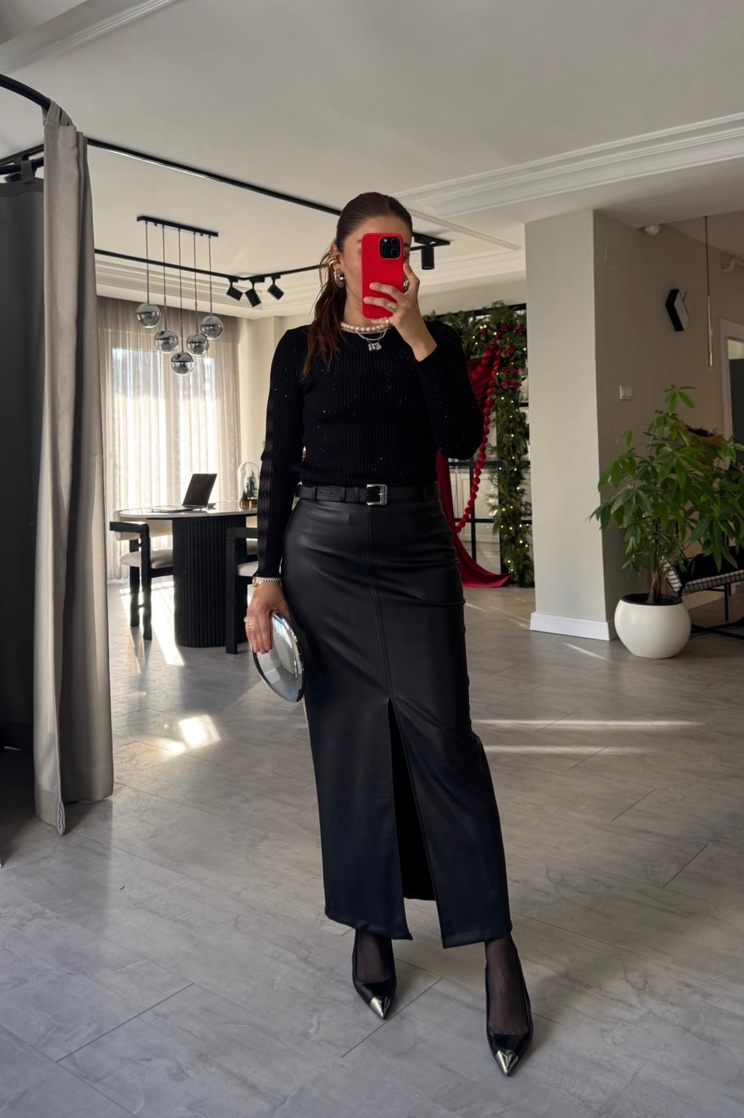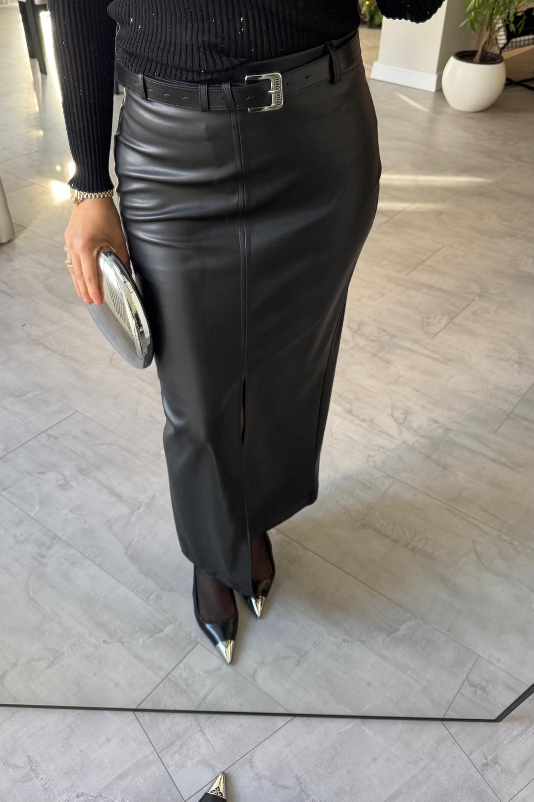 ÖNÜ YIRTMAÇLI MAXİ DERİ ETEK