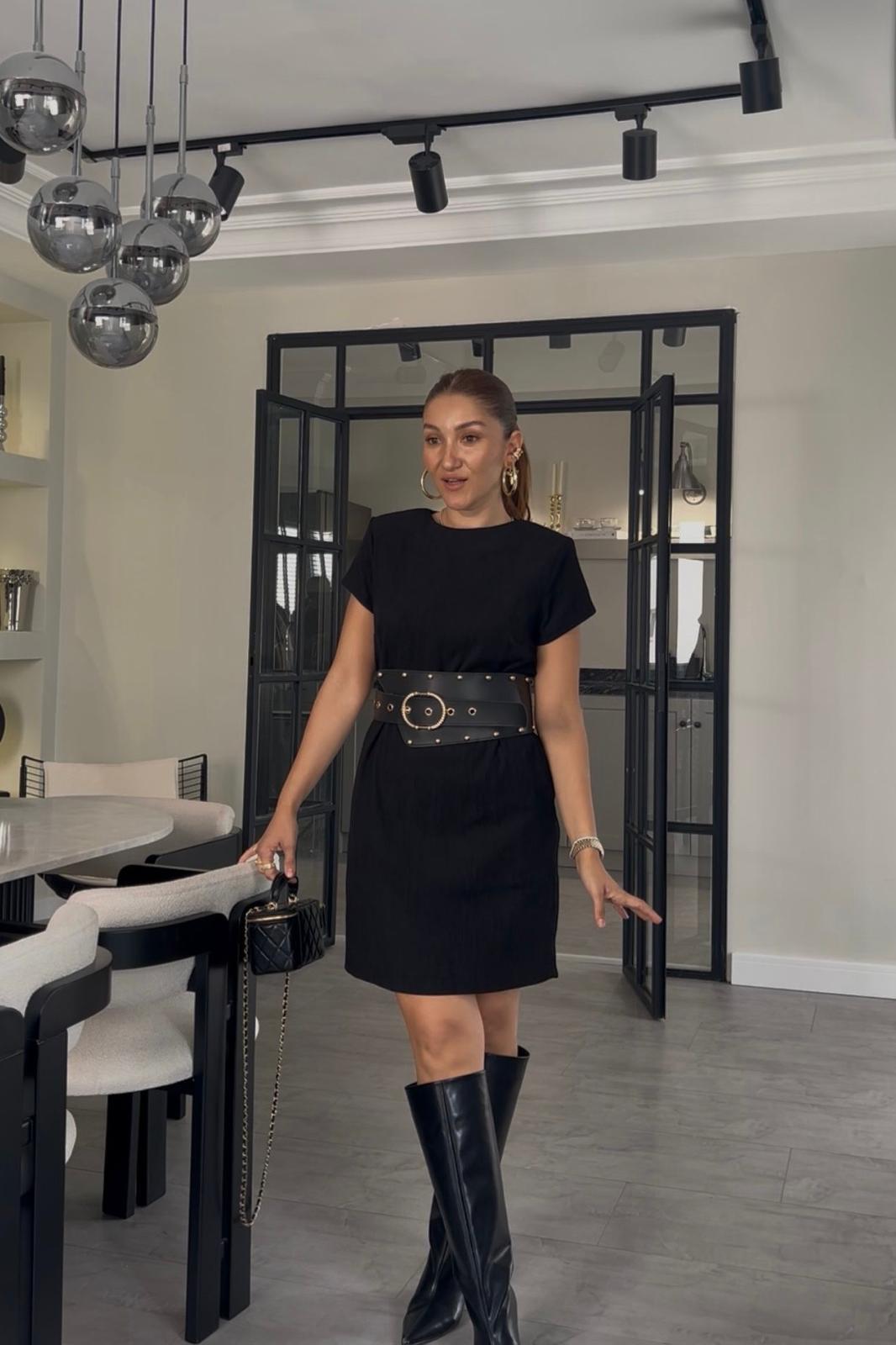 DERİ KEMERLİ VATKA DETAYLI MİNİ ELBİSE