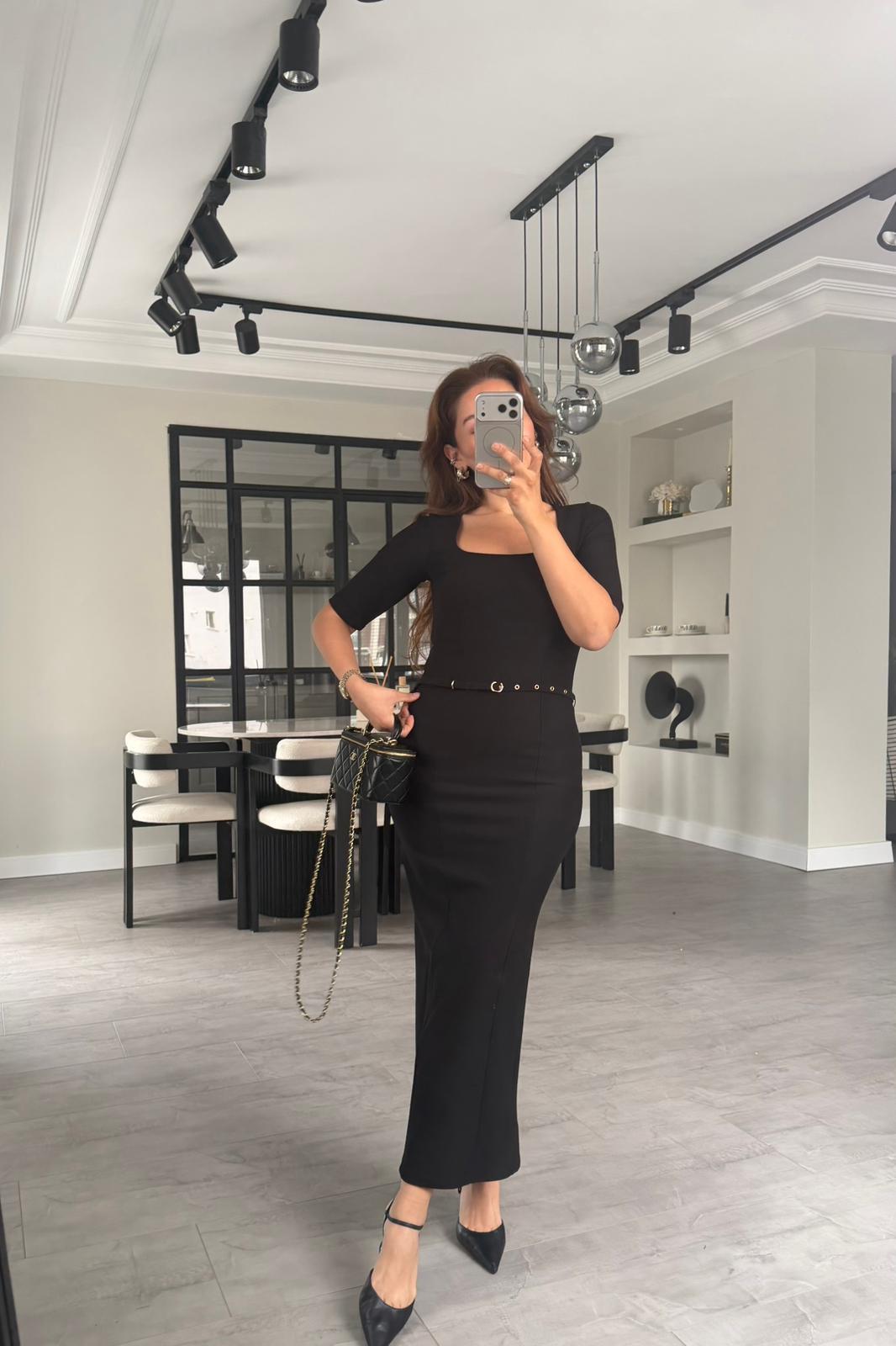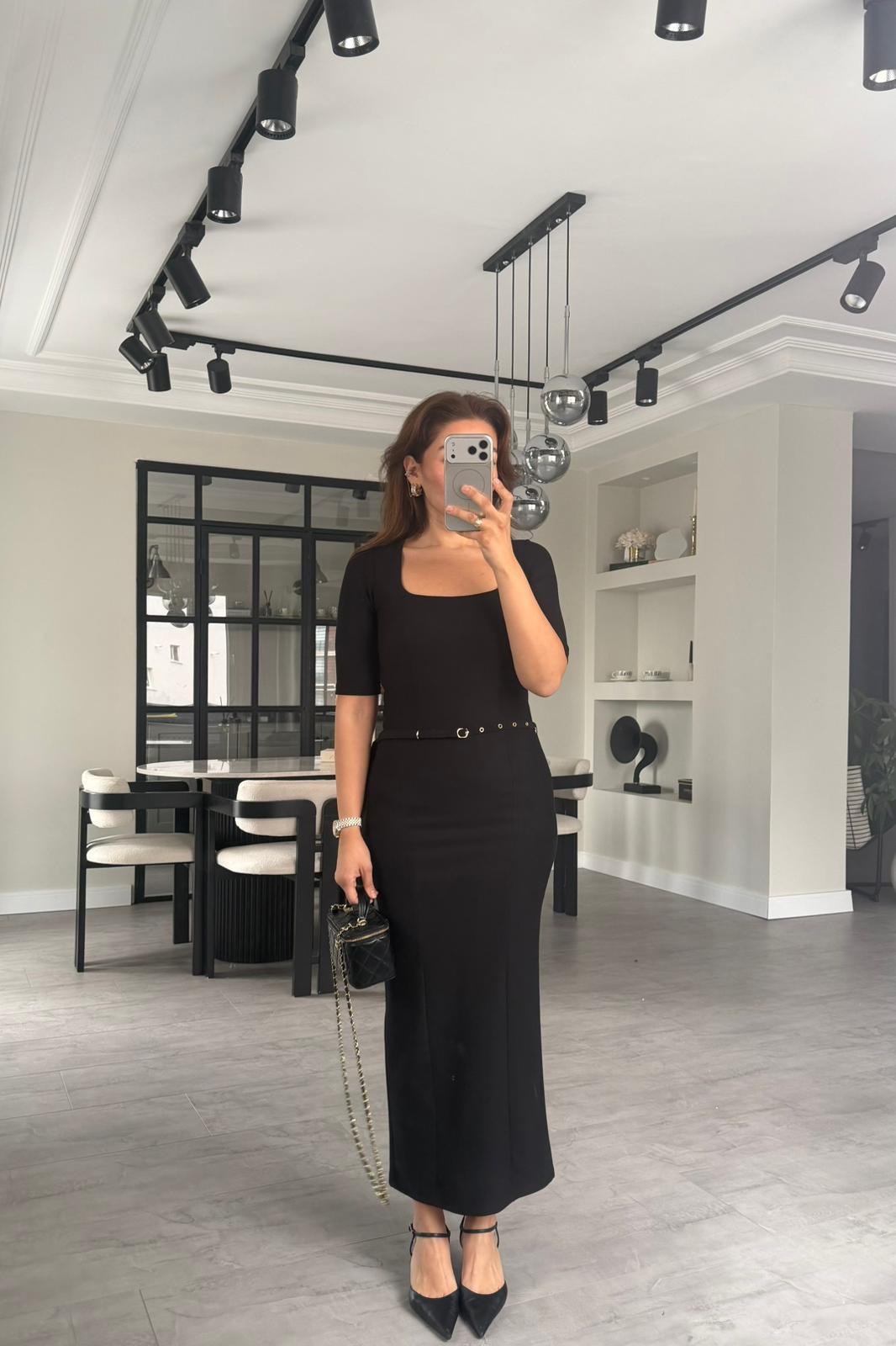 YARIM KOL KARE YAKA KEMERLİ ELBİSE/1271